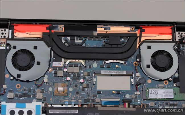 The cooling module of the ASUS ROG GL502VM features a dual-fan and three copper design. The CPU and GPU are covered by two heat pipes, one of which is connected to the fan’s heatsink. The fan and heatsink can be removed by unscrewing the screws, making it very easy to clean up dust.