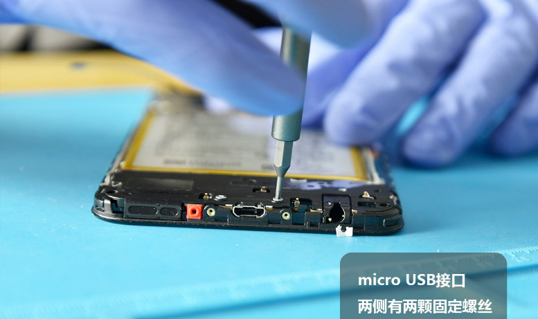 After disconnecting all connections, the motherboard cannot be removed directly. The screws need to be removed first, and then the loudspeaker can be taken out. This phone uses a traditional micro USB port, which is secured by screws on both sides. We need to remove the micro USB port.