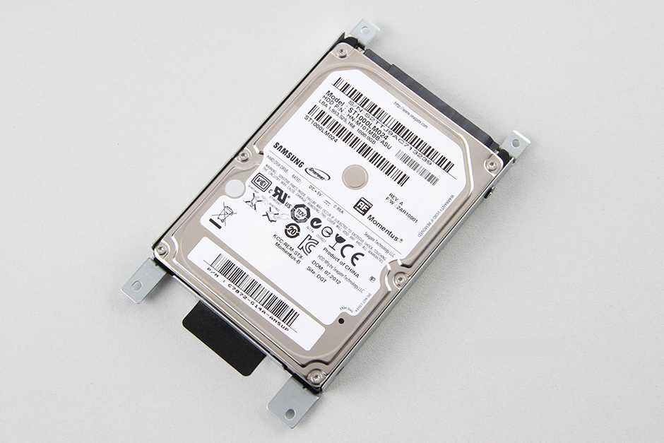 Remove three screws securing the hard drive. Lift up the black tape and slide it to the left.