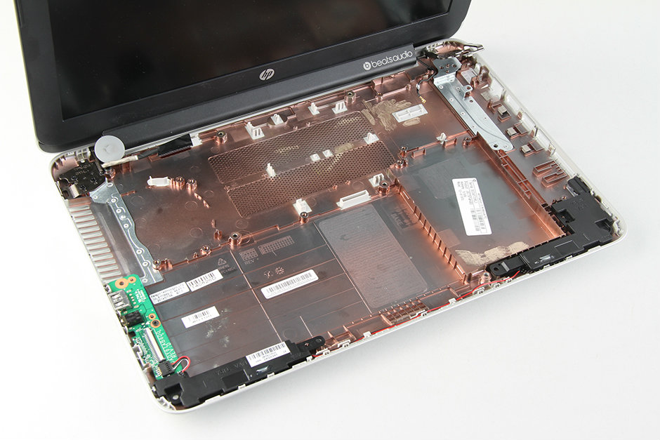 Under the palm rest, you can access the battery, hard drive, speaker, and cooling fan.