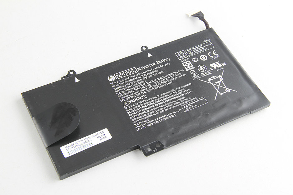 The HP Pavilion 13 comes with an 11.4V, 43Wh Li-ion battery. The HP part numbers are 760944-421 and HSTNN-LB6L. The battery cells should come from LG because the battery has the LG P/N: HP-011401-PRR13G01.