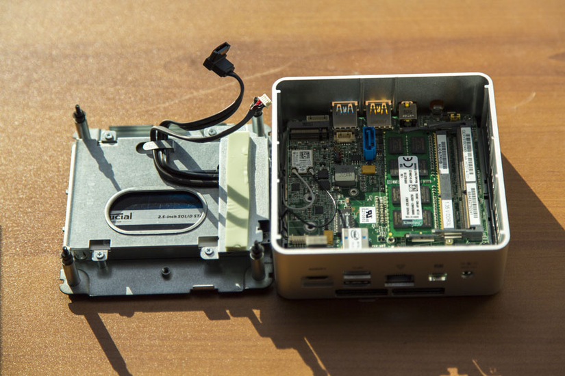 On the other side of the bottom panel, you can see a 2.5-inch SATA hard drive. Intel does not support any pre-installed hard disk, but because there is an M.2 slot on the motherboard, you can install an SSD.