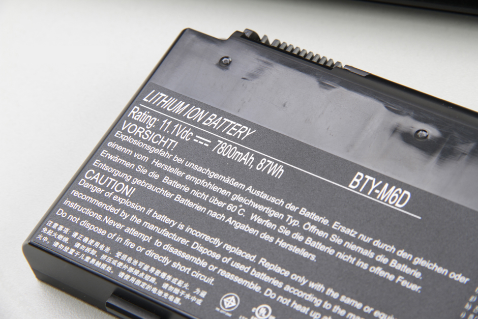 The laptop features an 11.1V, 7800mAh, 87Wh Li-ion battery. Its MSI part number is BTY-M6D.