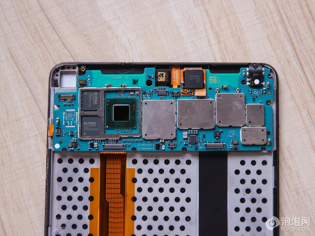 After removing the metal shield, we found thermal grease covering the processor. After removing the thermal grease, you can access the Atom X5-Z8500 processor and two ELPIDA memory chips.