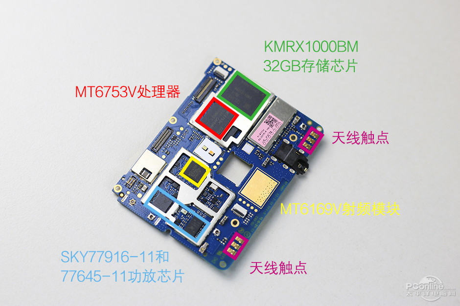 The other side of the motherboard has a MediaTek MT6753V processor, a Samsung KMRX1000BM 32GB memory chip, a MediaTek MT6169V RF chip, a SKY77916-11 chip, and a SKY77645-11 power amplifier chip.
