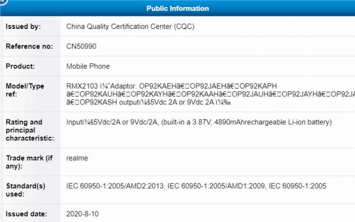 Both certifications have the model number RMX2103, which is the Realme 7i. This phone has received its NTBC certification, and its battery capacity and charging speed were revealed in the China Quality Certification Center.