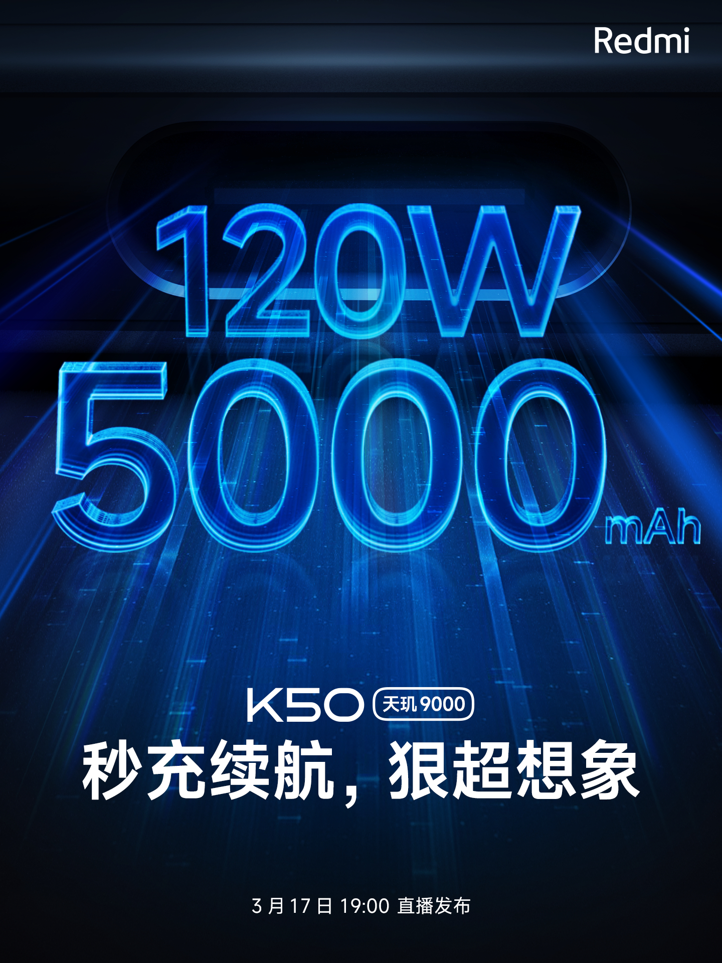 This morning, Redmi officially announced that the Redmi K50 will come with a 5000mAh battery and also support 120W charging.