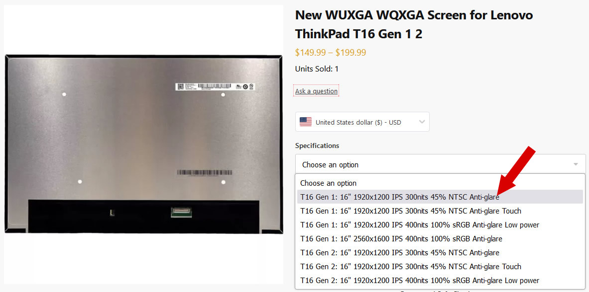 Select “T16 Gen 1: 16″ 1920×1200 IPS 300nits 45% NTSC Anti-glare” from the drop-down menu on the product page. Then click “add to cart”.